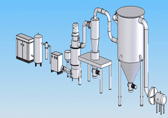 压缩空气经过滤干燥后,通过拉瓦尔喷嘴高速喷射入粉碎腔,在多股高压气流的交汇点处物料被反复碰撞、磨擦、剪切而粉碎,粉碎后的物料在风机抽力作用下随上升气流运动至分级区,在高速旋转的分级涡轮产生的强大离心力作用下,使粗细物料分离,符合粒度要求的细颗粒通过分级轮进入旋风分离和除尘器收集,粗颗粒下降至粉碎区继续粉碎。